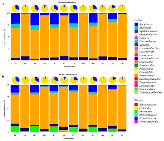 Relative abundances of bacterial phyla (pie charts) and an aggregation of the 21 most abundant bacterial genera (column charts) for the V1–V3 (A) and V3–V4 (B) regions of the 16S rRNA genes. Kefir product from Lithuania (LP), kefir grains from Lithuania (LG), kefir product from South Korea (KP), kefir grains from South Korea (KG), kefir product from Ireland (IP), kefir grains from Ireland (IG), kefir product from the Caucuses region (CP), kefir grains from the Caucuses region (CG), kefir product from Britain (BP), kefir grains from Britain (BG), kefir product from Fusion Tea (AP, Amazon), kefir grains from Fusion Tea (AG, Amazon).