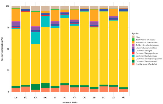 Differences exist in artisanal kefirs regarding microorganisms present in kefir products versus their grains. For example, L. kefiranofaciens exhibits a higher relative abundance in all kefir grains when compared to their corresponding products (Figure 2). Similarly, Lent. kefiri exhibits a higher relative abundance in kefir grains B, I, K, and L when compared to their corresponding products (Figure 2). On the other hand, Lent. kefiri exhibits a lower relative abundance (3%) in AG when compared to that (6%) of in AP (Figure 2).