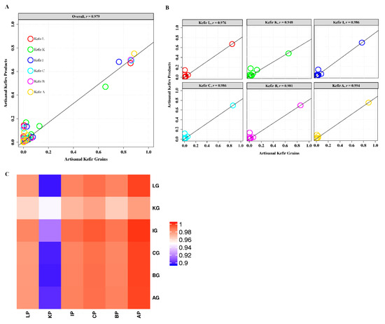 Kefir grains showed a high correlation to their products in their species content (Figure 4A–C). Kefir A presented the highest correlation between its grains and the product (r = 0.994), followed by kefirs I, C, B, and L with the following r values, respectively: r = 0.986, 0.986, 0.981, and 0.976. The lowest correlation was observed in kefir K (r = 0.948), (Figure 4B). The heatmap (Figure 4C) created confirmed that KG and KP had the lowest correlation with each other and the lowest correlation with all other kefirs (Figure 4C). The AP, on the other hand, appeared to have the highest correlation with all kefir grains (r = 1) except for KG. The AG was not highly correlated with other kefir products (Figure 4C).