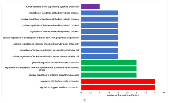 After a list of genes and transcription factors were identified, functional analysis was performed to identify significant pathways. A pathway was considered significant if the fold enrichment was over 70 and p-values less than 0.00041. Figure 2a represents the number of genes and transcription factors identified within each pathway. The majority of the pathways only reported a total of two genes or transcription factors. However, the pathways “regulation of interferon-β production” and “regulation of type II interferon production” identified the same four genes and transcription factors: TLR7, YY1, TLR9, and IRF1. Figure 2b also represents results from the function analysis, however, with specific focus on immune specific pathways. These pathways reported between one and four genes and transcription factors. They are shown in the Cytoscape network illustrated in the section below (Section 3.3), where they are integrated into a network of genes and transcription factors.