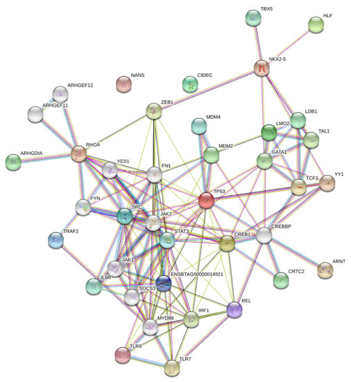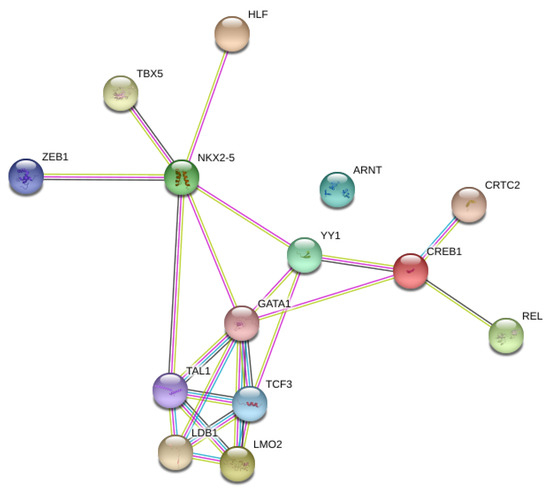 Network analysis of the relationships between the TFs, the genes, and then the genes and TFs were performed initially with STRING (Figure 3 and Figure 4). Since these figures are second or third interaction networks, there are genes included that are not included in original literature searches and pathway analyses and are not a part of the analysis. As shown by Figure 3, YY1 and NKX2-5 appear to be the largest hubs of predicted TFs. The TF ZEB1 is an alternative name of AREB6 and is only incorporated into the network through NKX2-5, which appears surprising. AREB6 is predicted in all genes except one, and therefore, is predicted for the same genes as the majority of the other transcription factors; however, the network only shows interaction with NKX2-5. Another surprising result from the network was that even in a second interaction network, ARNT does not have any interactions, which might represent an unrelated function to the other TFs. In Figure 4, some of the larger hubs from the original list of genes appear to be TLR9, TLR7, IL-6, TP53, and SRC, with the largest hub being RHOA. NANS is unconnected in this network, which is most likely due to its specific function as a gene. In Figure 5, a third interaction relationship, NANS, is still unconnected. ARNT becomes attached through an additional gene to YY1 and TP53, along with many other additional genes. NKX2-5 appears to be less of a hub than other transcription factors like ZEB1 (AREB6) and LMO2. The genes have much larger hubs than the transcription factors, with SRC, RHOA, and TP53 illustrating some of the largest original hubs. Figure 6 depicts the Cytoscape network, which incorporates transcription factors, genes, and immune significant pathways. Similar to earlier STRING networks, TLR7 appears to be a major hub of the network, creating the link between many transcription factors and pathways. YY1 appears to serve as a major transcription factor hub, even directly interacting with two major pathways “regulation of type I interferon production” and “regulation of interferon-β production”. Many of the transcription factors such as HLF, E4BP4, NRF-2, and ELK-1, only connect to a singular gene. Although HLF’s singular connection is to TLR7, the most prominent hub within the network, the transcription factors YY1 or AREB6, which interact with many genes including TLR7, appear to be a stronger target.