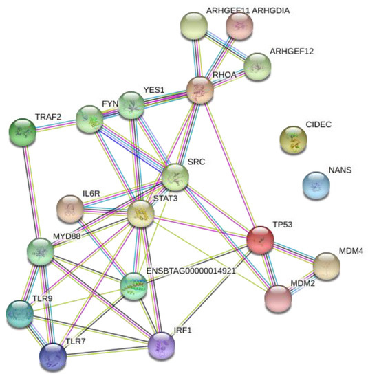 Network analysis of predicted genes. Protein-protein interaction network of immune genes associated with BCoV. (Edge color legend; blue: from curated database, pink: experimentally determined, green: text mining, brown: co-expression).