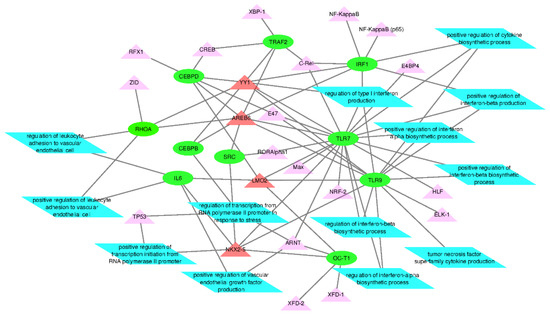 Network analysis of predicted genes, transcription factors, and immune specific pathways. The green circles represent genes and the blue parallelograms represent immune specific pathways. The transcription factors are represented by triangles, with the red representing many network connections, and the pink representing fewer network connections.