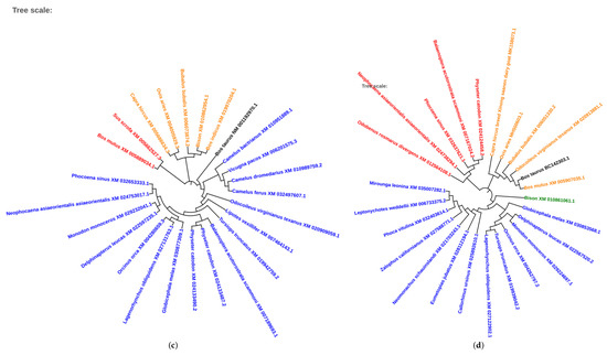 Based on the results of TF prediction, homolog searches were performed through NCBI BLAST to retrieve multiple sequences from unique species. Phylogenetic trees were produced for eight of the predicted transcription factors. The factors E47, RORAlpha1, and E4BP4 were not present on NCBI, Ensembl, or UniProt, and therefore were excluded from analysis. These trees are illustrated in Figure 7a–h. AREB6, which is depicted in Figure 7a, is highly conserved in comparison to Bos taurus within Bison and Bubalus bubalis clade. Bos indicus and Odocoileus virginianus texanus are also within the clade. ARNT, illustrated in Figure 7b, has less evolutionary conservation in relation to Bos taurus. The closest relation appears to be with Ovis aries. In Figure 7c, which depicts the transcription factor C-Rel, there appears to be a lack of evolutionary conservation. C-Rel appears to be the closest to Bos taurus for Capra hircus and Ovis aries. The transcription factor HLF, present in Figure 7d, appears to be the most conserved in relation to Bos taurus in the species Bubalus bubalis and Bos indicus. Odocoileus viriginianus texanus, Capra hircus and Bison are also within the clade. Figure 7e illustrates the phylogenetic tree of CREB, which appears to have the most conservation from Bos taurus in Bos mutus. LMO2, the transcription factor for Figure 7f, is highly conserved between Bos taurus and Bos indicus. Bison and Bos mutus also appeared to be conserved in relation to Bos taurus. NKX2-5, one of the most predicted transcription factors, is illustrated in Figure 7g. Bos indicus appears to be very highly conserved in relation to Bos taurus, with Bos mutus and Bison also appearing closely conserved. Figure 7h depicts YY1, where Bos indicus and Bison appear to be the most conserved in relation to Bos taurus. Species within these phylogenies were mostly consistent between the trees, resulting in very similar phylogenetic trees and therefore very similar relationships of conservation. From these eight transcription factors, the species that appear to be highly conserved in relation to Bos taurus include Bos mutus, Bos indicus, Bison, and Bubalus bubalis.