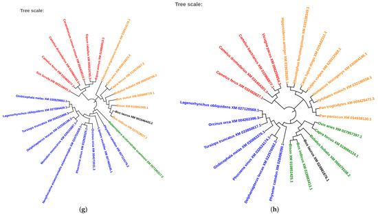 Phylogenetic tree representing the evolutionary conservation of transcription factors. Bos taurus is illustrated in black, and the nodes are color coded in four different groups, with red and orange representing the two different sub clades from the first divergence, and blue and green representing the other two sub clades. (a) Transcription factor AREB6; (b) ARNT; (c) C-Rel; (d) CREB; (e) HLF; (f) LMO2; (g) NKX2-5; (h) YY1.