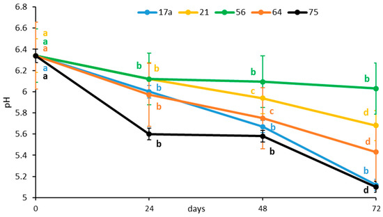 The initial pH value of the vegetable preparation was 6.34. The pH decreased rapidly after 24 h fermentation, irrespective of the LAB strain (Figure 1). The kinetics of the decrease differed between the two strains because the medium fermented with strain 75 reached a pH value of 5.60 after 24 h compared to 6.00 for strain 17a. The LAB strain 56 showed the smallest decrease in pH (5.83) after 24 h of fermentation.