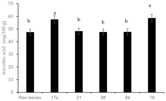 Fermented leaves with LAB strains 75 and 17a demonstrated the highest retention of ascorbic acid content (Figure 4). Cactus cladodes (Opuntia ficus-indica L.) [22] and amaranthus paste [23], showed a similar increasing trend in ascorbic acid after fermentation. In contrast, no increase in ascorbic acid was detected in pineapple juice fermented with LAB strains [24].