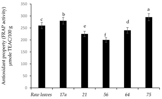 Figure 5 presents the FRAP antioxidant activity of nightshade vegetables after fermentation. Fermentation by LAB strains 75 and 17a increased the antioxidant activity of the nightshade leaves by 11.9% and 7.1%, respectively, compared to the unfermented (raw) leaves. Nightshade leaves fermented with strain 56 showed the lowest antioxidant activity. Coumaric acid contributed significantly to the antioxidant property followed by vanillic and gallic acids (Supplementary Table S1). Therefore, an increase in antioxidant activities was associated with the release of phenolic compounds during fermentation. However, Kaprasob et al. (2017) [18] showed a decrease in antioxidant activity in cashew apple juice and explained that this could be due to oxidation of phenolic compounds. Numerous studies have underlined a beneficial health effect for antioxidant-rich foods, such as reducing the risk of non-communicable diseases and premature ageing [34].