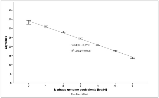 The limit of detection was determined to be lower than 1 genomic copy/µL. There was a log-linear correlation between Cq values and the number of phage genome equivalents. The standard deviations of the mean Cq values ranged between 0.17 and 0.19 with slightly higher values at lower bacteriophage concentrations (<102 Izv phage genome equivalents). The detection of 100 genome equivalents failed in three runs. Positive fluorescence signals were routinely checked by melting curve analysis.