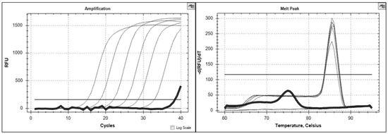 BPHeli qPCR amplification curves and melting peaks of a standard curve (melting point at 85.5–86°C) with one true-negative control (no melting peak) and one false-positive negative control highlighted in bold (melting point at 76.5 °C).