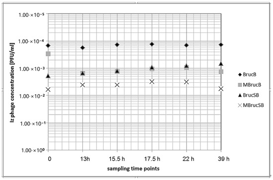 The matrix effect could not be exclusively explained by the added raw milk because there was also a decrease in the phage concentration (approx. 1 log10) when BrucB (Brucella broth) and BrucSB (selective Brucella broth) were compared. The measured Izv phage concentration remained stable over 39 h except for MBrucB (raw cow’s milk in Brucella-broth) (Figure 4). After 13 h, we observed a decline of the phage concentration in MBrucB of about 1 log10 value.