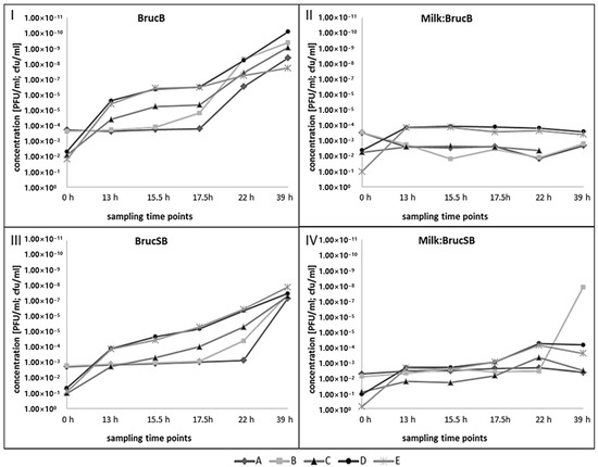 Izv phage propagation and B. microti 4910T growth at 37 °C for 39 h in I—Brucella-broth (BrucB), II—raw cow’s milk in Brucella-broth (1:10, MBrucB), III—selective Brucella-broth (BrucSB), IV—raw cow’s milk in selective Brucella-broth (1:10, MBrucSB) including Izv phage and B. microti in initial concentrations of A + C- 106 PFU/mL and 101 cfu/mL, B + D- 106 PFU/mL and 102 cfu/mL, E- 0 PFU/mL and 102 cfu/mL. A + B show the concentrations of Izv phage in PFU/mL determined by BPHeli qPCR, C + D + E show the concentrations of B. microti in cfu/mL determined by the IS711 qPCR.