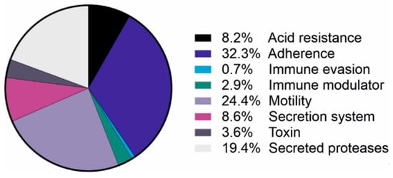 H. pylori OMVs exhibit a large heterogeneity in their protein composition. Interestingly, in contrast to the lipid composition, the proteome of OMVs significantly differs from whole cells and periplasm, suggesting a regulated sorting mechanism as is well known for mammalian EVs [38,41]. OMVs are predominantly enriched in uncharacterized proteins, flagellar basal body proteins [39] or outer membrane proteins (OMPs) (Table 2) [41]. More than 500 different H. pylori proteins were identified using mass spectroscopy analyses. However, most available reports show conflicting data, most likely due to the unstandardized sample preparation and analysis protocols. Nevertheless, the heterogeneity of OMV proteins is influenced by strain type, different culture conditions and bacterial growth phase [23]. Consistently identified targets include the proteins involved in cellular processing and signaling (especially cell motility and cell wall, membrane or envelope biogenesis), metabolism (energy production and conversion), and several well-known H. pylori virulence factors. Proteins identified in OMVs and considered as virulence factors (Table 2) belong to the group of proteins implicated in adherence, motility, acid resistance, immune evasion and modulation, and protein secretion of proteins (Figure 1).