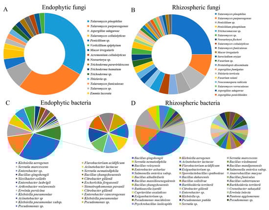 Taxonomic affiliations based on partial 16S rRNA and internal transcribed spacer (ITS) gene sequencing analysis: The relative abundance of cultivable bacteria and fungi inhabiting upland rhizosphere and endophyte. (A) Fungi isolated from endophyte, (B) Fungi isolated from rhizosphere, (C) Bacteria isolated from endophyte, (D) Bacteria isolated from rhizosphere.