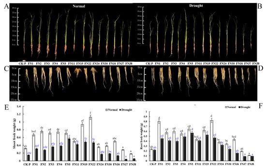 After performing media screening and in vitro tests, we selected 14 bacteria (7 endophytes and 7 rhizosphere microbes) and 13 fungi (10 endophytes and 3 rhizosphere microbes) with which to inoculate rice seedlings (Table 1). We further studied the effects of different endophytic and rhizosphere fungi on the rice growth and drought tolerance (Figure S1). Upon inoculation, fungi promoted rice growth, as indicated by the significantly greater plant shoot and root FW compared to that of the CK-P (CK) under both non-stressed conditions and drought-stress conditions (Figure 2). After seven days of water deprivation, the non-inoculated CK rice became wilted and desiccated, whereas the inoculated plants were not severely affected, with only slight curling of the leaf tips (Figure 2A–D). Compared to that of the non-inoculated stressed CK rice, the shoot and root FW of the inoculated rice increased significantly (Figure 2A–F). Under non-stressed conditions, fungi FN22 (Chaetomium pilosum) and FN19 (Aspergillus aureolus) increased the FW of aerial parts of the rice seedlings (by 364.69% and 280.15%, respectively); in addition, fungi FN22 (Chaetomium pilosum) and FN1 (Talaromyces pinophilus) also significantly increased the FW of rice roots (247.33% and 238.47%, respectively). Under drought stress, FN22 (Chaetomium pilosum) increased the shoot FW of rice (216.05%), and FN5 (Talaromyces purpureogenus) increased the shoot and root FW to the greatest degree (by 280.21% and 158.75%, respectively). Similarly, in response to FN19 (Aspergillus aureolus) inoculation, the FW of rice roots increased significantly (138.85%). Other selected endophytic and rhizosphere fungi also presented obvious growth-promoting effects. However, inoculation FNJ7 (Trichocomaceae sp.) and FNJ8 (Hypocreales sp.) reduced plant growth under non-stressed conditions (−16.25% and −62.58% of shoot FW, respectively; −17.39% and −51.70% of root FW, respectively) and under drought-stress conditions (−70.66% and −61.51% of shoot FW, respectively; −59.05% and −56.93% of root FW, respectively). The above results indicated that inoculating upland rice with endophytic or rhizosphere fungi has a positive impact on rice growth under both non-stressed and drought-stress conditions, suggesting that these isolates play a dual role in increasing rice plant growth and drought stress tolerance (Figure S1).