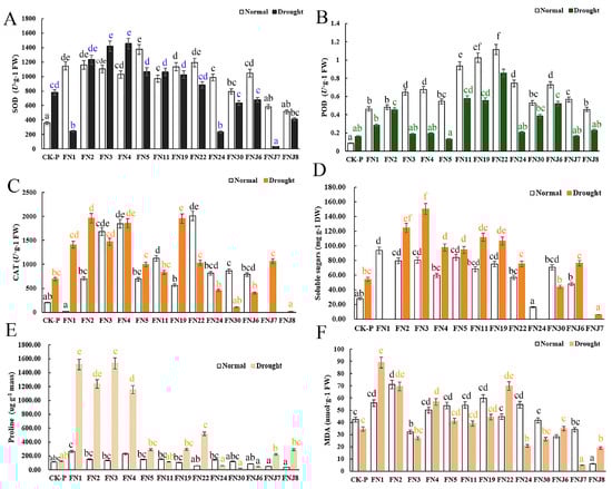 To evaluate how fungi promote plant growth and alleviate drought stress, physiological parameters, including plant soluble sugar, Pro, MDA, and leaf chlorophyll contents, and activities of antioxidant enzymes, such as superoxide dismutase (SOD), peroxidase (POD), and catalase (CAT), were measured (Figure 3). Under non-stressed conditions, rice inoculated with fungi presented increased CAT, POD, and SOD activities as well as increased soluble sugar, Pro and chlorophyll contents. Moreover, the MDA content was higher in these rice plants compared with the non-inoculated CK rice plants (Figure 3F). After the plants were exposed to drought stress, the Pro and soluble sugar contents and the SOD, CAT, and POD activities increased significantly in the rice inoculated with fungi compared to the non-inoculated CK rice. The antioxidant enzyme activity and plant soluble sugar contents were greater in the drought-stressed plants inoculated with fungi than in the non-inoculated CK plants. In addition, compared with those in the CK plants, the concentrations of MDA in the inoculated plants increased. Like the phenotypic results, the rhizosphere-inhabiting FNJ7 (Trichocomaceae sp.) and FNJ8 (Hypocreales sp.) also exerted no growth-promoting effects on the physiological parameters, and the antioxidant enzyme activities of the plants inoculated with these fungi were significant lower than those of CK. Taken together, these results suggested that the majority of here tested fungi may be involved in antioxidant metabolic pathways and may regulate the activity of antioxidant enzymes.