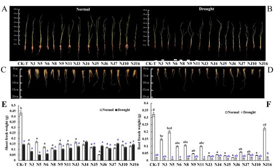 At one week after planting and no watering, irrigation was resumed for 1 day, plant health was assessed and imaged [14], and the plants were harvested (three CK and drought replications per treatment). The fresh weight (FW), length of the roots and shoots and leaf chlorophyll contents were measured. Before harvest, several physiological values such as shoot length were measured (see below). Leaves from each treatment were collected and used for measurements of shoot proline (Pro), soluble sugar, malondialdehyde (MDA), superoxide dismutase (SOD), peroxidase (POD), catalase (CAT), and total chlorophyll contents, as described in a previous study [14]. Total chlorophyll a (Chla) and chlorophyll b (Chlb) contents were analyzed according to the methods in a previous study [16]. Fresh parietal lobe leaf material (0.1 g) was collected, frozen in liquid N and ground into powder with a mortar and pestle. The total pigments were extracted after the material was ground and then extracted with 2 mL of 90% acetone. The crude extracts were then centrifuged at 1500 g for 5 min. The supernatant was kept, and the pellet was discarded [68]. Quantification was performed via spectrophotometry at 663 nm and 645 nm. The amount of chlorophyll was calculated according to the following formulas: Chla (μg mL−1, FW) = 12.72A663 − 2.59A645; Chlb (μg mL−1, FW) = 20.31A645 − 4.91A663; and CChl (μg mL−1, FW) = 20.29A645 + 8.05A663 [69].