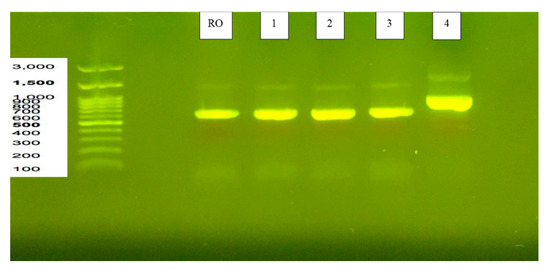 Results of agarose gel electrophoresis analysis for DNA identification of 4 strains isolated from natural tempeh. Strains 1, 2, 3 and 4 had rRNA sequences ranging from 0.5 to 1.0 kb; strains RO, 1, 2 and 3 had the same sequence of around 0.5 kb, while Strain 4 was around 1.0 kb.