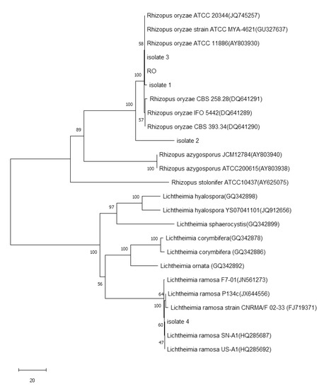 Based on the ITS tree (Figure 2) generated using neighbor-joining analysis, the Mucorales strains we used were divided into two groups, Genus Rhizopus and Genus Lichtheimia. Strains R. oryzae, R. azygosporus, R. stolonifera, L. hyalospora, L. sphaerocysis, L. corymbifera, L. omata and L. ramosa were also classified into specific taxa, respectively. Among the strains in this study, Isolate 1, Isolate 2, Isolate 3 and all R. oryzae strains were assigned to the same clade, the three isolates belonging to R. oryzae. Isolate 4 was found in the branch of the clade of L. ramosa in the group of Lichtheimia, indicating that Isolate 4 was a member of L. ramose.