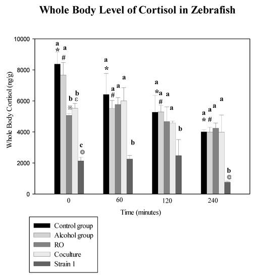 The zebrafish were exposed to 50 mL of the three tempeh extract solutions (RO, tempeh fermented by R. microsporus var. oligosporus RO (ATCC 22959); co-culture, co-culturing R. microsporus var. oligosporus IFO 8631 (ATCC 22959) and Lactobacillus rhamnosus BCRC16000; and Strain 1) as well as ethanol only (75% alcohol, 50 mL) and no treatment at all as controls for 15 min. They were then submitted to acute stress (Figure 3). Cortisol reduction was assessed post stress at 0, 60, 120, and 240 min. Exposure to tempeh fermented with Strain 1 had the greatest effect on the whole-body cortisol level, resulting in an impaired cortisol response to the acute stressor at 240 min (756.7 ± 71.5 ng g−1) as compared with the RO group (4239.4 ± 338.6 ng g−1), though the fish exposed to Strain 1 and stress had lower pre-stress cortisol concentrations than the RO tempeh + stress groups.