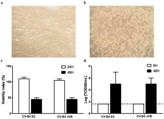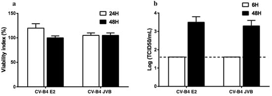 Infection of human primary macrophage cultures by Coxsackievirus B4 (CV-B4). Peripheral blood mononuclear cells from 13 healthy donors were isolated as previously described and cultured for 24 h. Thereafter, floating cells were removed to obtain a monocyte-enriched culture that was treated with macrophage-colony stimulating factor. Seven days later, the cultures were infected with CV-B4 E2 or CV-B4 JVB (multiplicity of infection: 1); (a) 24 and 48 h post-infection, the cellular viability was measured using the Orangu® viability assay, and results are expressed as the percentage of viability compared with controls (Mean ± SD, n = 13). (b) The supernatants are harvested 6 and 48 h post-infection to evaluate the level of infectious particles by titration, and the results are expressed as TCID50/mL; mean ± SD of log-transformed values are shown (n = 13). The dotted line indicates the threshold of the viral titration method (log 101.5 TCID50/mL).