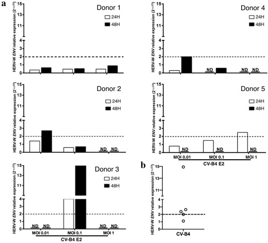 PBMCs were isolated from 13 buffy coats as described in Materials and Methods. The culture was rinsed to get rid of other cell types and obtain monocyte-enriched PBMCs as they attached to the surface of the plate; they were then treated with M-CSF to further induce complete differentiation of monocytes into macrophages. Macrophage cultures were then inoculated with CV-B4 E2 or CV-B4 JVB (MOI = 1 or MOI = 10) and incubated for 6, 24, and 48 h. Cell viability was assessed with Orangu® as previously described. The viability of mock-infected and infected cell cultures was similar (Figure 5a). The infectious titers in the supernatants of cultures were 101.5 and > 103 TCID50/mL at 6 and 48 h post-infection, respectively (Figure 5b). In cultures of macrophages isolated from five of 13 buffy coats, the relative expression of HERV-W ENV in infected cultures was >2-fold either 24 or 48 h post-infection when inoculated with CV-B4 E2 or CV-B4 JVB at MOI = 1 or MOI = 10 (Figure 6).