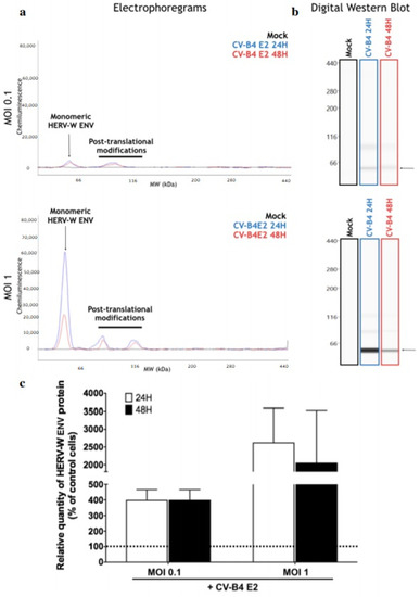 The level of HERV-W ENV protein in primary ductal cells infected by CV-B4 E2 was evaluated using automated Western blot. When cell cultures were inoculated with CV-B4 E2 (MOI 0.1), the levels of HERV-W ENV protein at 24 and 48 h post-infection were four times greater than the non-specific background signal of the corresponding mock-infected cultures. When cell cultures were inoculated with CV-B4 E2 (MOI 1), the levels of HERV-W ENV protein at 24 and 48 h post-infection were 25 times and 20 times greater, respectively than the threshold of mock-infected cultures (Figure 3).
