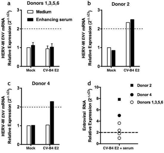 PBMCs were obtained from buffy coats of six healthy donors (Figure 4). The cells were cultured under various conditions followed by the recovery of adherent cells. The level of HERV-W ENV in adherent cells was evaluated using RT-qPCR. Compared with the HERV-W ENV global level in control conditions, there was no increased expression when PBMCs from donors 1, 3, 5, and 6 were inoculated with CV-B4 E2 (MOI = 1) alone (Figure 4a), whereas an increased expression of HERV-W ENV was found in PBMCs from donor 2 (relative expression 2.34-fold greater than the mock culture) (Figure 4b). Human immune serum (dilution 1/1000) mixed with CV-B4 E2 enhanced the infection of PBMCs from donors 2, 3, and 4 as shown by the level of enteroviral RNA in these cells compared with that in the controls (relative expression 7.85-, 3.65-, and 5.02-fold greater than mock cultures, respectively) as well as enhanced the infection of PBMC from two other donors but to a lower extent (Figure 4d). In parallel, CV-B4 mixed with diluted immune serum (1/1000 dilution) increased or induced transcriptional upregulation of HERV-W ENV in donors 2 and 4 (relative expression 2.5- and 2.29-fold greater than mock cultures, respectively) (Figure 4a–c). Of note, CV-B4 infection of PBMCs from another donor was not enhanced by the immune serum (Figure 4d).