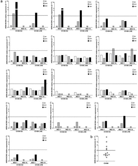 Individual representation of Human Endogenous Retrovirus W Envelope (HERV-W ENV) mRNA expression in macrophages infected by Coxsackievirus B4 (CV-B4). Macrophages from 13 healthy donors were prepared as previously described in the legend of Figure 5. Total RNA was extracted from the cells 6, 24, and 48 h post infection with TriReagent, and the level of intracellular HERV-W ENV mRNA in each culture was assessed in duplicate using RT-qPCR normalized with beta-actin mRNA expression. Each result is the mean of two or three determinations; furthermore, each RT-PCR datum is the mean of two technical duplicates. The relative expression of HERV-W ENV mRNA in CV-B4 E2-infected cultures compared with that in mock-infected cultures is calculated using the 2-ΔΔCt method. (a) The individual relative expression of HERV-W ENV for each culture is shown. ND: not done due to an insufficient number of cells. (b) The maximum individual relative expression of HERV-W ENV for each culture is shown. The dashed line represents a relative expression of 2.