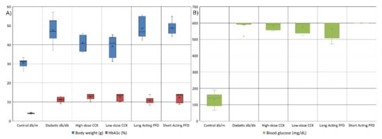 The db/db mice had significantly elevated body weights, HbA1c, and glucose levels compared to the db/m controls (Figure 1). High levels of HbA1C are associated with CKD [55]. For the control db/m mice, the average body weight, HbA1c, and glucose levels were 30.4 g, 3.99%, and 131.8 mg/dL, respectively. In the case of diabetic db/db mice, the average weight, HbA1c, and glucose levels increased to 47.7 g, 11.24%, and 588.5 mg/dL, respectively (Figure 1A). The db/db mice treated with long-acting PFD had slightly lower average HbA1c and glucose levels at 10.8% and 565.2 mg/dL, respectively, with negligible weight changes (Figure 1B). On the other hand, short-acting-PFD-treated db/db mice had higher HbA1c, weight, and glucose levels than db/db mice. Both high- and low-dose-CCK-treated db/db mice lost an average weight of 7.0 g and had small decreases in glucose levels but slightly higher levels of HbA1c as compared to db/db mice. Only CCK-treated mice significantly lost weight (p-value < 0.05) compared to db/db mice. Changes in other data types were not statistically significant.