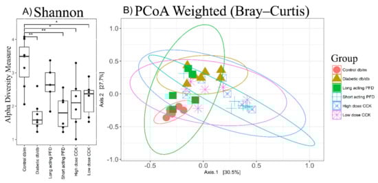 (A) Alpha diversity plot displaying the Shannon index for different groups with x-axis represents the Shannon index. Significance levels between two groups is indicated by stars (* 0.01 to 0.05, ** 0.001 to 0.01) and no comparison/stars mean no statistical significance was found between groups. High alpha diversity represents a healthy gut microbiome. (B) Principal coordinate analysis (PCoA) plot showing the control db/m clustering separate than db/db mice but overlapping with long-acting-PFD-treated db/db mice. The x- and y-axes represent the first and second components of the PCoA plot, respectively.