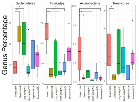 Next, we used the DESeq2 package in R that uses a negative binomial model to determine the differentially abundant genera in the comparison of control db/m and db/db mice and with the four treatment groups. At the phylum level, the db/db mice had higher levels of Bacteroidetes and lower levels of Firmicutes, Actinobacteria, and Tenericutes. Mice treated with long-acting PFD had a higher abundance level of Firmicutes, Actinobacteria, and Tenericutes as compared to db/db mice, whereas short-acting PFD featured a lower abundance of Bacteroidetes as compared to db/db mice (Figure 3). Dominant SCFA producers belong to the phylum Firmicutes, and treatment with long-acting PFD indeed increased the abundance of Firmicutes towards the values for the control db/m mice [56].