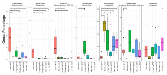 Selected genera with abundance levels comparable in long-acting PFD and control db/m cases obtained with DESeq2 with FDR less than 0.05. Significance levels between two groups is indicated by stars (* 0.01 to 0.05, ** 0.001 to 0.01) and no comparison/stars mean no statistical significance was found between groups.