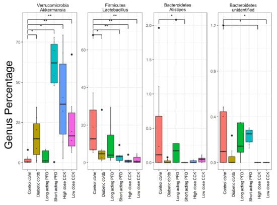 In the case of db/db mice treated with long-acting PFD, Akkermansia, Lactobacillus, Alistipes, and unidentified Bacteroidetes abundances resembled those of control db/m mice more than those of diabetic db/db mice (Figure 5). A single species of the genus Akkermansia has been cultured, A. muciniphila, a mucin-degrading bacterium. A. muciniphila strengthens intestinal epithelial cell integrity and triggers cross-talk with the host by degrading the colonic mucin layer [60]. Its abundance in the gut is inversely correlated with the onset of inflammation during obesity [60]. Interestingly, db/db mice treated with short-acting PFD and, to some extent, those of the high-dose CCK group revealed a much higher abundance of A. muciniphila as compared to db/m mice and those of the long-acting-PFD-treated group. The average weights of the mice part of the long-acting and short-acting PFD groups as well as those of the db/db mice were similar, with approximately 48 g, and 15% lower than for high-dose CCK mice. Thus, there was no direct correlation between A. muciniphila abundance and the weight of mice.