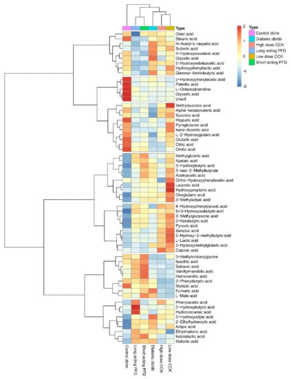 We measured the abundances of 62 metabolites in urine, expecting data on kidney filtration and excretion products to be physiologically linked to renal functions in control db/m, diabetic db/db, and the four db/db mouse drug treatment groups. Metabolite abundance patterns clustered db/m mice in a defined space representing healthy kidneys. This was in good agreement with data on animal weight, blood glucose, and HbA1c levels. The db/db mice treated with long-acting and short-acting PFD clustered separately from db/db mice and CCK treatment groups (Figure 6; Supplementary Figure S3).