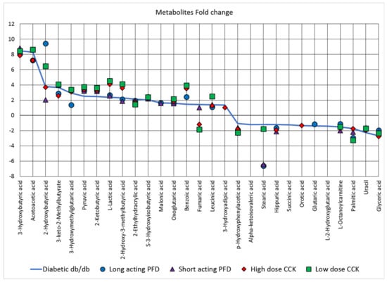The log fold change of 29 metabolites differentially abundant in diabetic db/db mice (shown as a solid blue line) as compared to the control db/m mice (baseline at zero on the y-axis). The metabolites above the baseline at zero are more abundant, whereas metabolites below the baseline at zero are less abundant in db/db mice as compared to control db/m mice. The symbols represent the log fold change of the respected four treated mice groups in comparison with the control db/m mice.
