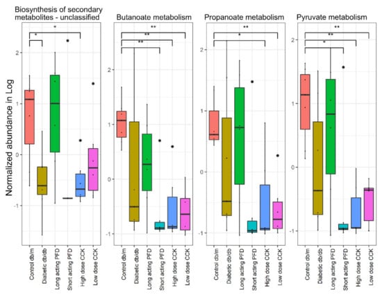 The molecular functions present in the KO (KEGG Orthology) were inferred using the Piphillin web server and mapped to their respective KEGG pathways. One-way ANOVA was used to determine differentially abundant pathways comparing control db/m, diabetic db/db, and all four treatment groups. We observed 192 pathways with different abundances of molecular functions among the mouse groups with an FDR less than 0.05 (Supplementary Table T2 and Figure S5). The molecular functions of butanoate, propanoate, and pyruvate metabolism pathways (SCFA pathways) were downregulated in diabetic db/db mice as compared to control db/m mice. Apart from SCFA pathways, various molecular functions in pathways for secondary metabolite biosynthesis were also downregulated in diabetic db/db mice (Figure 8). Among the four treatment groups, only the group treated with long-acting PFD showed an increase in SCFAs production and biosynthesis of secondary metabolites, in further support of our hypothesis that long-acting-PFD-treated mice featured a recovery of gut microbiota diversity. These encouraging in silico results should be corroborated with evidence from deep metagenomic sequencing and SCFA quantitative measurements in the future.