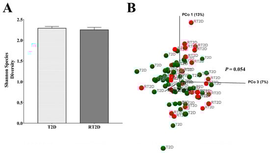 The microbial diversity of different groups. (A) No significant differences were observed concerning the α-diversity (Shannon index) when comparing microbial communities from T2D and RT2D. (B) The β-diversity of the principal coordinate analysis (PCoA) demonstrated marginally significant differences (p = 0.054) in the total microbial composition between T2D and RT2D groups.