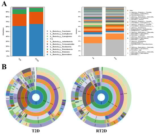 Operational taxonomic units (OTUs) at the phylum and species level between T2D and RT2D. (A) The relative abundance of OTUs at the phylum and species level in T2D and RT2D groups. (B) Krona charts revealed that the relative abundance of Bacteroide was increased, and A. muciniphila and Fusobacterium were diminished in the samples from participants diagnosed with RT2D.