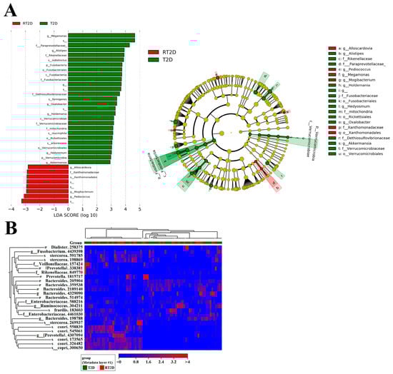 Microbial markers that distinguish between T2D and RT2D. (A) linear discriminant analysis effect size (LEfSe) analysis revealed that Verrucomicrobia, A. muciniphila and Fusobacteria were more abundant in T2D patients. (B) Heatmap analysis representing relatively high (red) and low (blue) abundances of specific microbial constituents in fecal samples from T2D and RT2D patients.