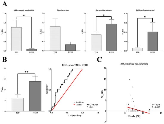 We further calculated a value representing the percentage of Bacteroides vulgatus minus the sum of the percentages of A. muciniphila, Fusobacterium and Veillonella denticariosi. This average value (T2D: 6.12 versus RT2D: 13.86, p < 0.01) was evaluated further using the receiver operating characteristic curve (ROC curve). The area under the curve (AUC) was 0.719 (p < 0.01), displaying acceptable discrimination for use in distinguishing patients with RT2D from those with T2D (Figure 4B). Equally importantly, we found that the relative proportion of A. muciniphila was significantly negatively correlated with levels of HbA1c (r = −0.248, p = 0.02, Figure 4C). These results reveal that A. muciniphila is a unique glucose-related microbial marker that reflects the clinical status of both T2D and RT2D patients.