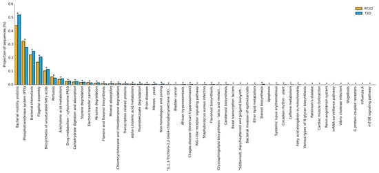 To further determine the function of the microbiome in T2D and RT2D patients, we used a PICRUSt prediction of different proportions of the microbiome against the KEGG level 3 pathway; the criteria included the removal of unclassified reads, a value of p <0.05 and an effect size of 1 from STAMP software. We identified 50 functional pathways that were enriched in RT2D versus T2D, and most pathways were too small to be considered further; thus, we concentrated on those with a proportion of ≥0.05%. Compared with the results from T2D patients, pathways contributing to the proportion of the microbiome against the biosynthesis of unsaturated fatty acids and arachidonic acid metabolism were reduced, and those associated with the phosphotransferase system (PTS) were increased in RT2D patients (Figure 5). These results indicated that the differences observed concerning the microbiome content might have an impact on several critical functional pathways.