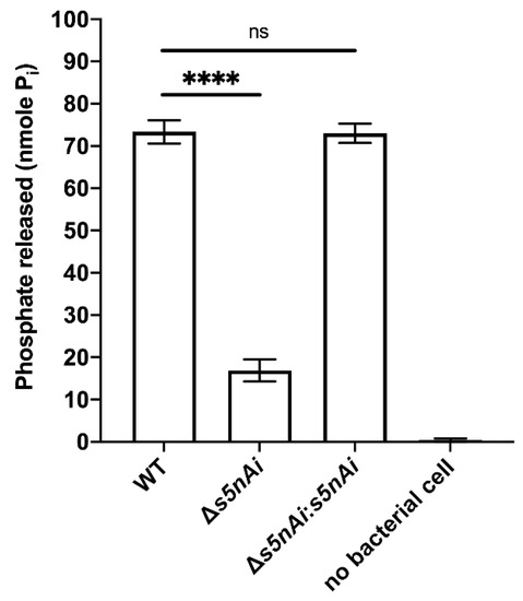 Nucleotidase activity of S. iniae strains. WT, ∆s5nAi and ∆s5nAi:s5nAi were incubated with 1 mM AMP as a substrate and the Pi released was measured using a malachite green phosphate colorimetric assay. Error bars show the standard deviation of three experiments performed in triplicate. ****, p < 0.0001; ns, not significant (as determined by an unpaired two-tailed t-test).