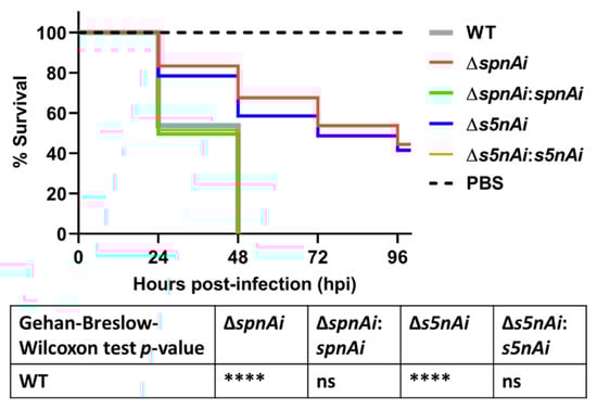 Survival analysis of zebrafish larvae infected with WT and mutant S. iniae strains. WT, ∆spnAi, ∆s5nAi and their complementation strains were each injected into 2 days post-fertilization (dpf) larvae (wild-type AB line). The survival of infected larvae was recorded over a 96 h-period. This data is the combined result from 3 independent experiments (n = 35 per group in each experiment). ****, p < 0.0001; ns, not significant (as determined by the a Gehan–Breslow–Wilcoxon test).