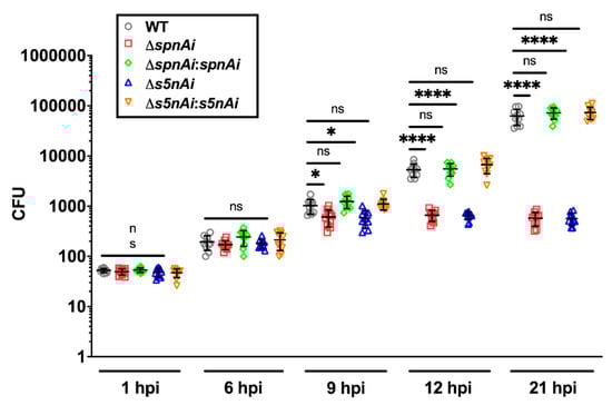 Bacterial load of zebrafish larvae infected with WT and mutant S. iniae strains. WT, ∆spnAi, ∆s5nAi and their complementation strains were each injected into 2 dpf larvae (wild-type AB line). The bacterial load of infected larvae (n = 5 per group in each experiment) at indicated time-points were quantified by plating on kanamycin-containing THY+P agar plates. This data is the combined result from 2 independent experiments (n = 5 per group in each experiment). The error bars show the standard deviation of two experiments. *, p < 0.05; ****, p < 0.0001; ns, not significant (as determined by a 2-way ANOVA with a Tukey’s multiple comparisons test).