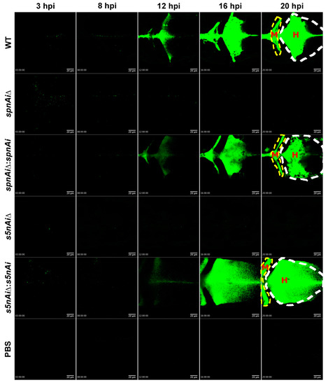 Time-lapse confocal imaging of 2 dpf zebrafish larvae infected with green fluorescent-labeled S. iniae or mutant strains. Confocal microscopy was used to observe the proliferation and dissemination of green fluorescent-labeled S. iniae at the infection site. Larvae (wild-type AB line) were injected with 50 colony-forming units (CFU) of gfpmut2-labelled WT, ∆spnAi, ∆spnAi:spnAi, ∆s5nAi, ∆s5nAi:s5nAi and sterile PBS at the hindbrain ventricle. Images of the hindbrain ventricle in dorsal view were taken from 3 to 21 hpi using a confocal microscope with a 20× objective lens. Five frames at 3, 8, 12, 16 and 20 hpi were extracted from the individual movies. H, hindbrain ventricle; M, midbrain ventricle. Scale bar, 20 µm. In the supplemental materials, see Movies S1. Results are representative of 2 independent experiments.