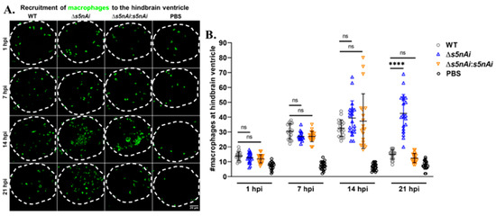 Quantification of macrophages recruited to the site of S. iniae infection. (A) Immunofluorescence detection of macrophage recruited to the hindbrain ventricle of Tg(mpeg1:EGFP)gl22 larvae infected with 50 CFU of WT (first column), Δs5nAi (second column), ∆s5nAi:s5nAi (third column) or sterile PBS (last column) at 1 hpi (first row), 7 hpi (second row), 14 hpi (third row) and 21 hpi (last row). The larvae (n = 20 per group per time-point) were infected at 2 dpf and fixed at indicated time-points. Confocal microscopy was used to image immunostained macrophages at the hindbrain ventricle of each larvae in the dorsal view (white dotted line). Scale bar, 20 μm. (B) Quantification of macrophages in the hindbrain ventricle of individual larvae. An increase in the number of macrophages recruited to the hindbrain ventricle of infected larvae was seen compared to larvae injected with sterile PBS. The number of macrophages at the infection site for all infected larvae peaked at 14 hpi. At 21 hpi, the number of macrophages recruited to the infection site of larvae infected with WT and ∆s5nAi:s5nAi was significantly lower as compared to Δs5nAi. ****, p < 0.0001; ns, not significant (as determined by a 2-way ANOVA with a Tukey’s multiple comparisons test).