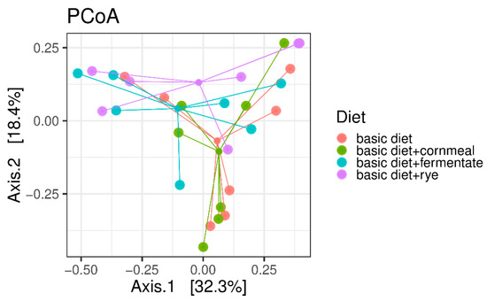 Bray–Curtis dissimilarity-based principal coordinate analysis (PCoA). Each point represents a different animal; coloured lines connect samples of one dietary treatment (vegetarian diet (basic diet) and the vegetarian diet supplemented with feather meal as well as either cornmeal (basic diet + cornmeal), fermented rye (basic diet + fermentate) or rye (basic diet + rye)).
