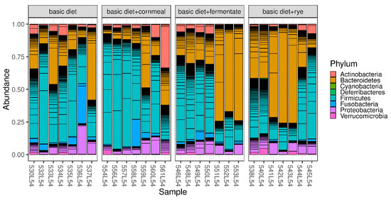 Faecal microbiota were dominated by Firmicutes and Bacteroidetes. Relative abundances of bacterial phyla per sample are shown in Figure 3 separated by dietary treatment. The corresponding values averaged over the dietary treatments are shown in Table 3.