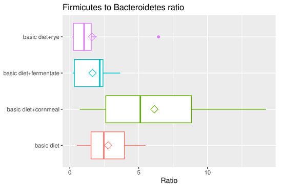 The ratio of Firmicutes to Bacteroidetes in samples belonging to the different feeding groups were calculated in every single sample and plotted in groups as a box-and-whisker plot in Figure 4.